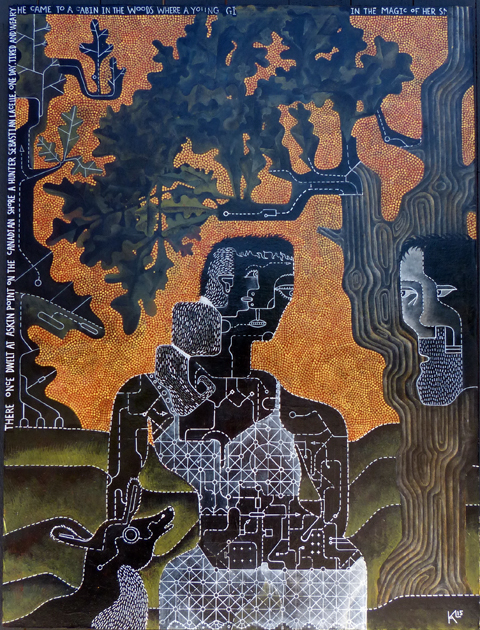 All the works in the exhibit related to the city’s early history as a French colony; participating artists were asked to create artworks relating to legends of old Detroit. The legend of the Nain Rouge and the tale of the Loup Garou were two favorites among many others that the artists chose for their commissioned works. My own picture “At Askin Point” relates to the tale of La Chasse Gallerie (The Wild Aerial Hunt).