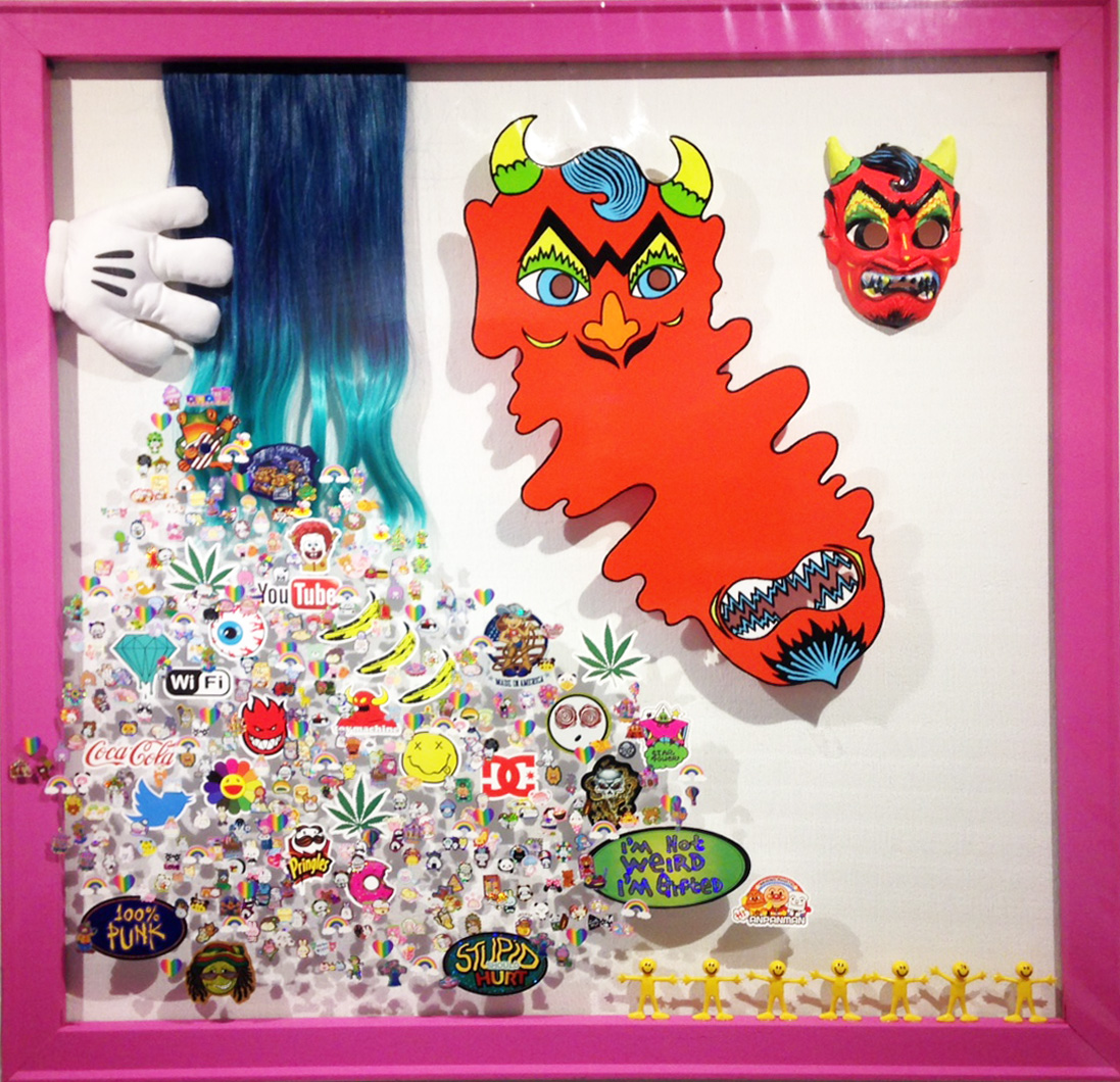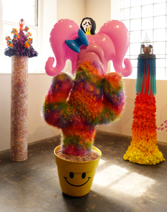 Kasztelan seems especially at ease in three dimensions. The most assured and ambitious work in the show, entitled The Alien with the Drake Tattoo/Dedicated to the Butterfly, is a kind of altar (complete with Juggalo nativity) that seems to burst out of a black cloud (of depression?) She seems less at ease in the conventional rectangular format of her paintings, which felt a bit awkward to me. But she has very cleverly circumvented this unease in The Devil’s Vibrating Smile by applying the imagery to clear vinyl. My favorite piece was a fake fur potted plant infested with tiny toy babies and topped by a pink plastic bouffant, entitled Baby Cactus is Happy. This show made me happy too.