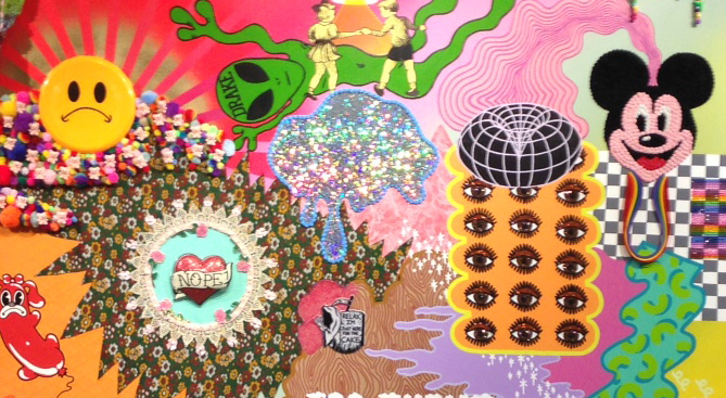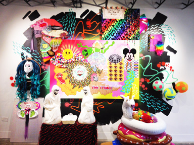 Somewhere over the Rainbow is Another Rainbow at Hatch Hamtramck is Shaina Kasztelan’s poison pen love letter to kitsch and consumerism. This Detroit artist and recent CCS grad seems to simultaneously love and hate the symbols and materials that she uses to create her wildly entertaining installations, paintings and sculptures.