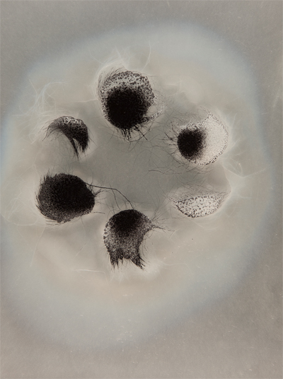 Dog hair, optical fiber and typewriter tape are the eccentric components that characterize the work of Sharyn O’Mara. Particularly prominent in this exhibit are her carbon burn-out “drawings” on glass. These hair-on-glass process pieces are abstract, yet often seem to reference seed pods or plants. They have an ethereal quality, as if they might disappear into thin air, blown away by fugitive winds.